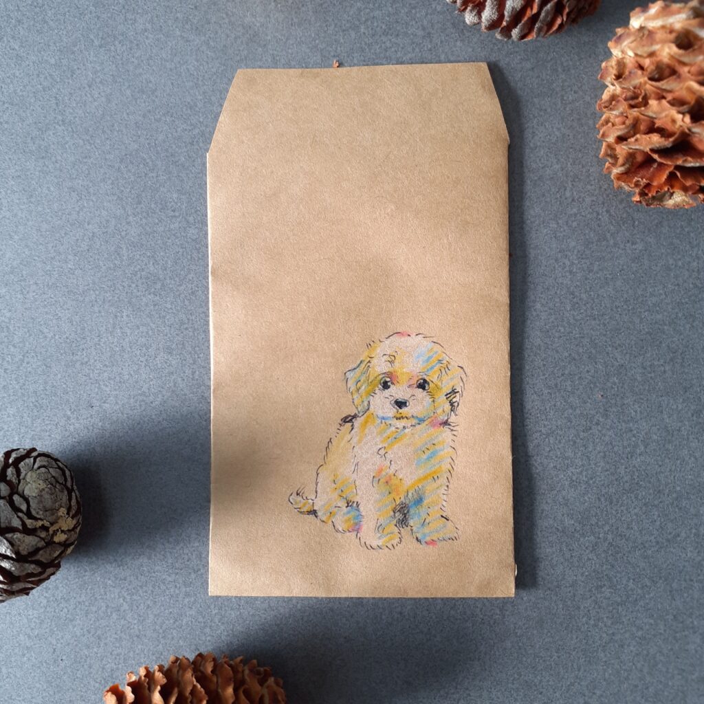 やさしい色合いで描かれた、子犬のイラストがかわいいポチ袋です。