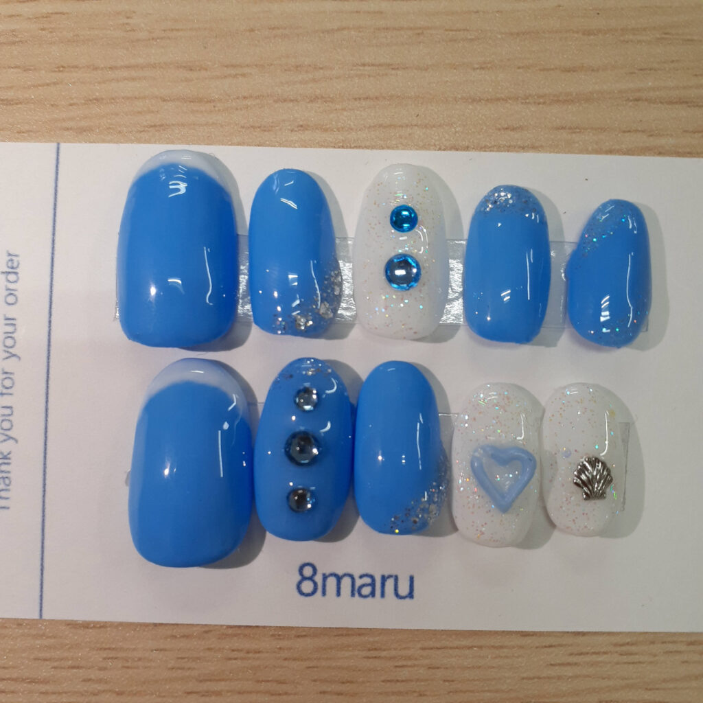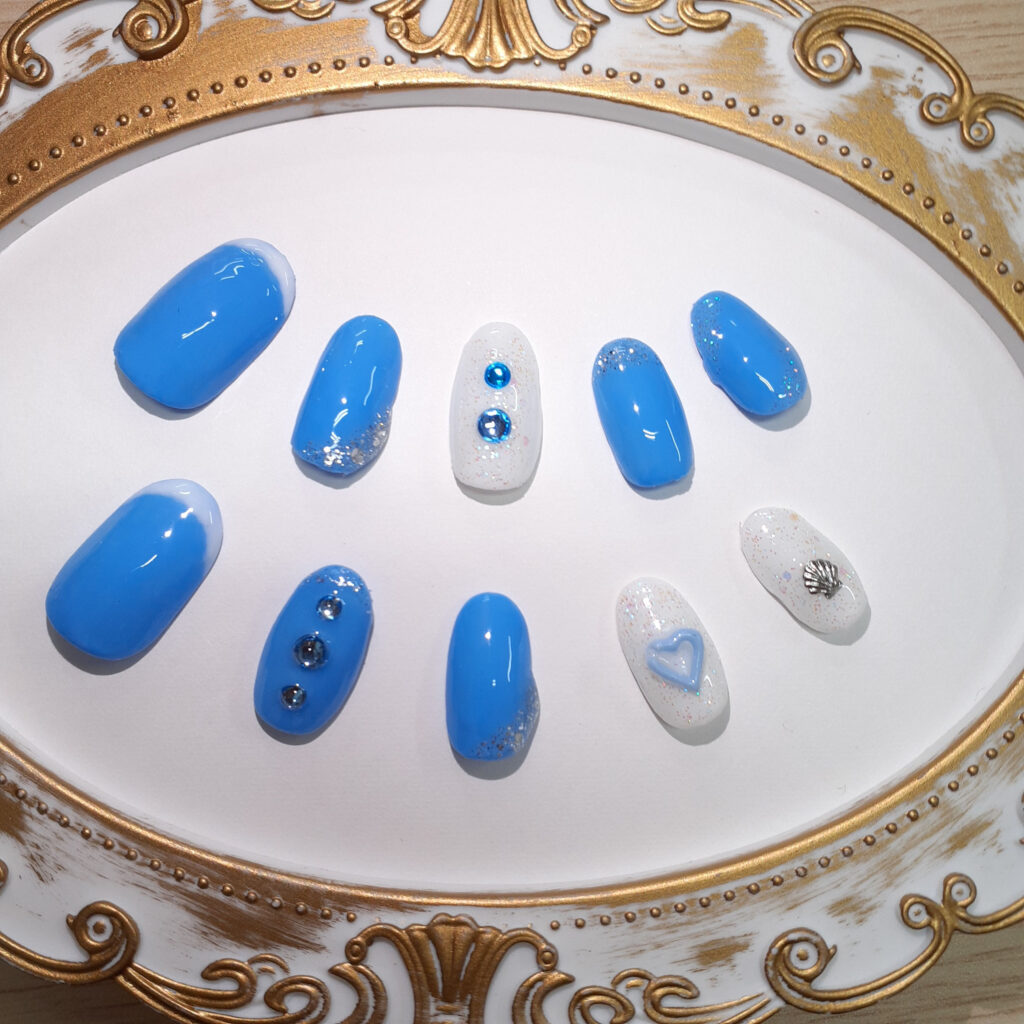 ネイルチップ マリンブルー×ハートネイル 2025年12月23日 / 0件のコメント 爽やかなマリンブルーとホワイトを組み合わせた、夏にぴったりのキュートなネイルチップです。キラキラ輝くラメやストーン、ぷっくりハートのデザインが指先を可愛く彩り、まるで海辺にいるような気分に。シェルパーツもプラスされて、夏のお出かけやリゾートシーンにぴったりです。 ハンドメイドならではの温かみがあり、普段使いから特別な日まで幅広くお楽しみいただけます。※やすり・テープは付属しておりませんので、お手持ちのものをご使用ください。 販売ページHACHIMARUマリンブルー×ハートネイル