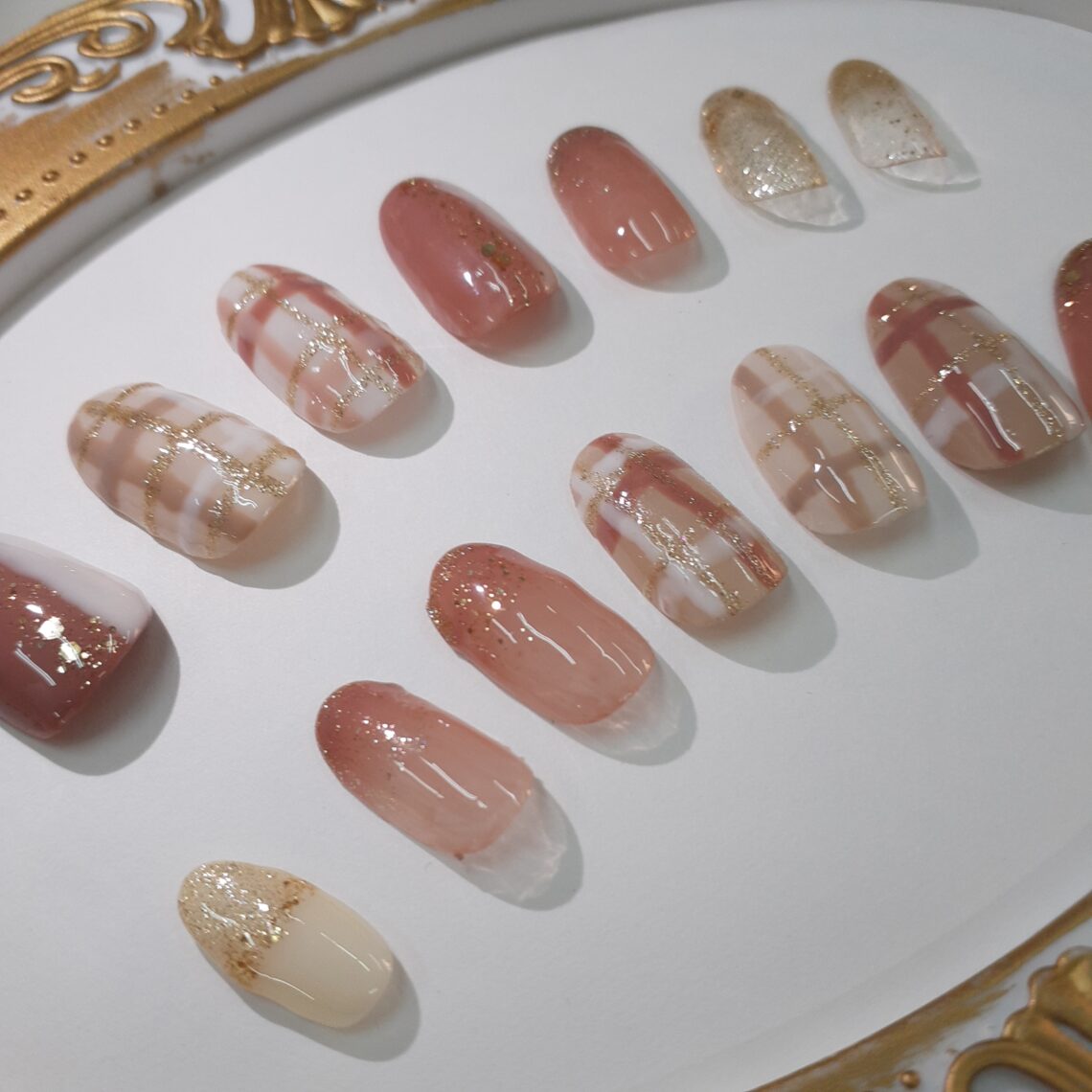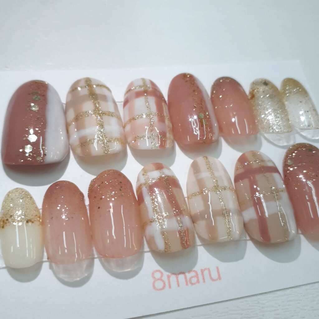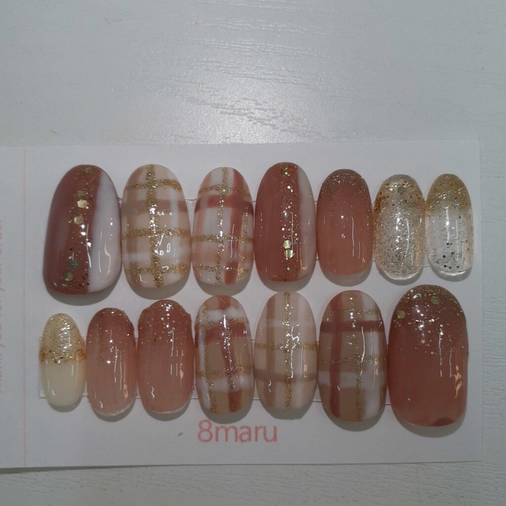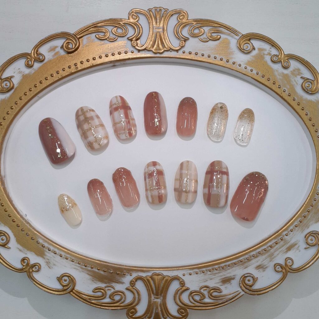 大人可愛いチェックネイル ブラウン×ゴールド 秋冬ネイルチップ