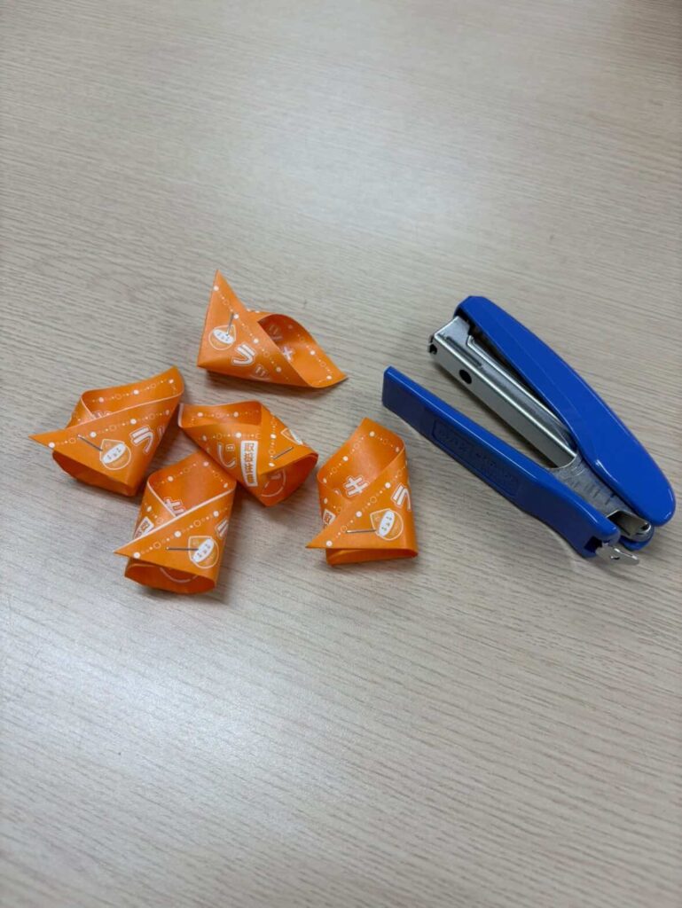 三角形に折り、ホチキスで留めたら完成☆